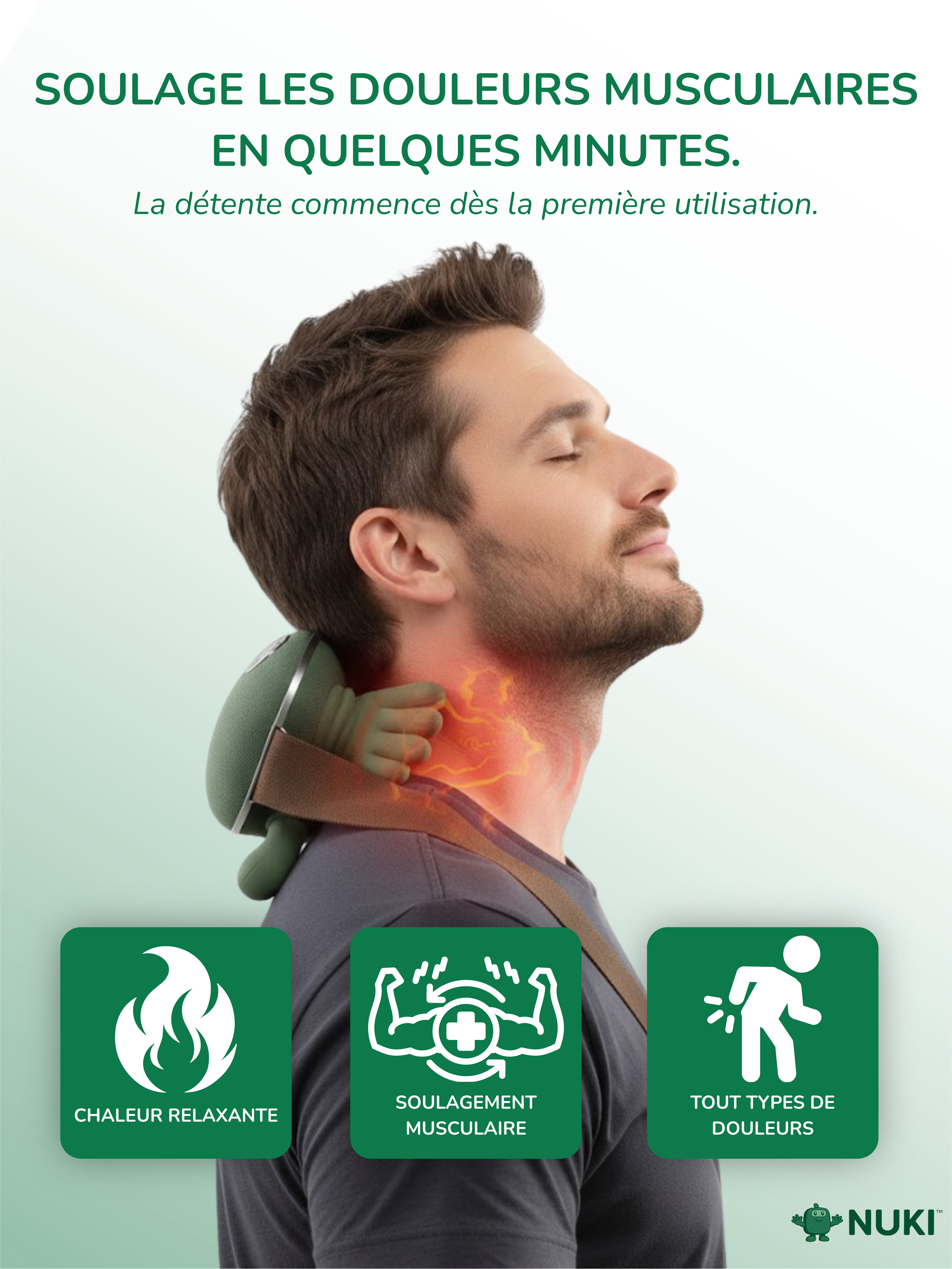 Chez NUKI™, notre mission est d’accompagner chaque personne confrontée aux tensions musculaires et au stress, avec des solutions simples, efficaces et accessibles.