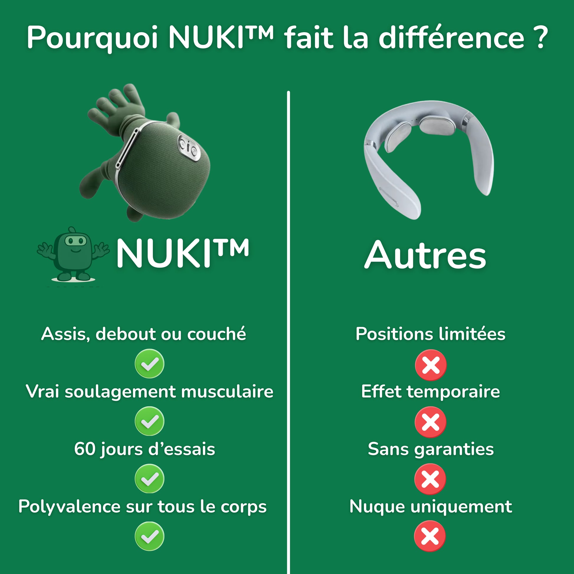 NUKI™ aide à relâcher les tensions musculaires liées au stress, aux mauvaises postures ou à l’effort physique, pour un confort ressenti dès les premières utilisations.